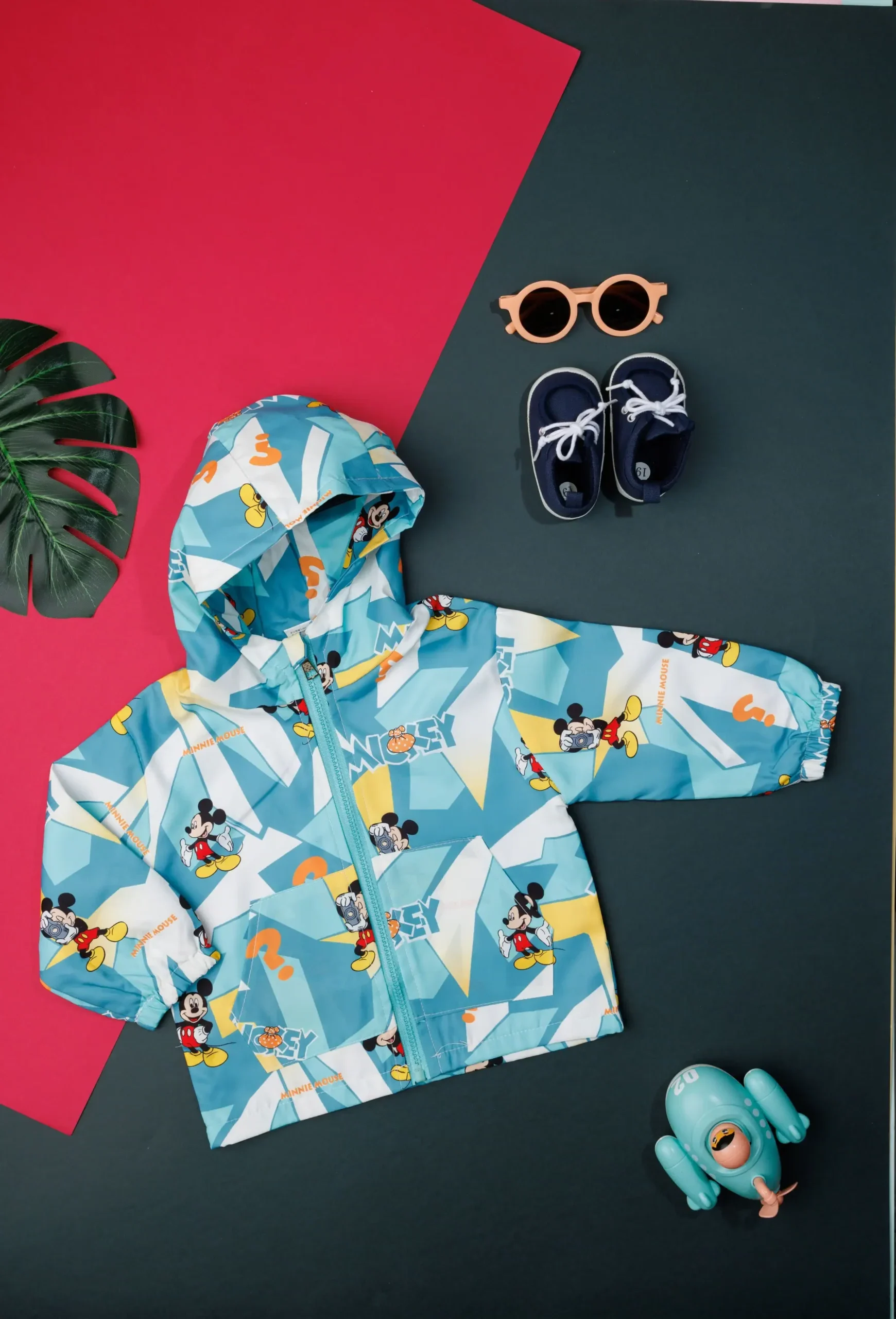 - Sky blue jacket with a Micky mouse pattern