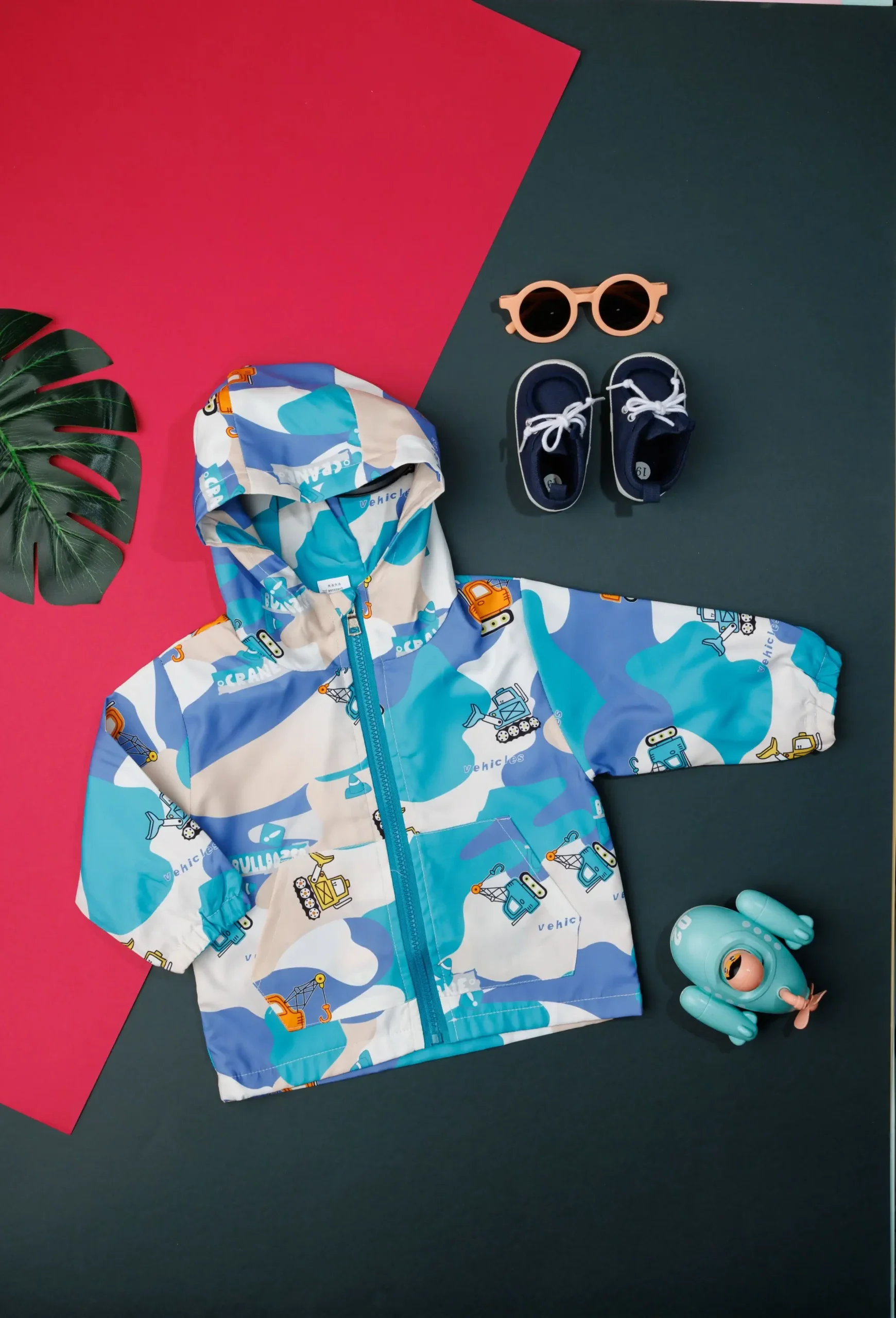 - Sky blue jacket with vehicle pattern