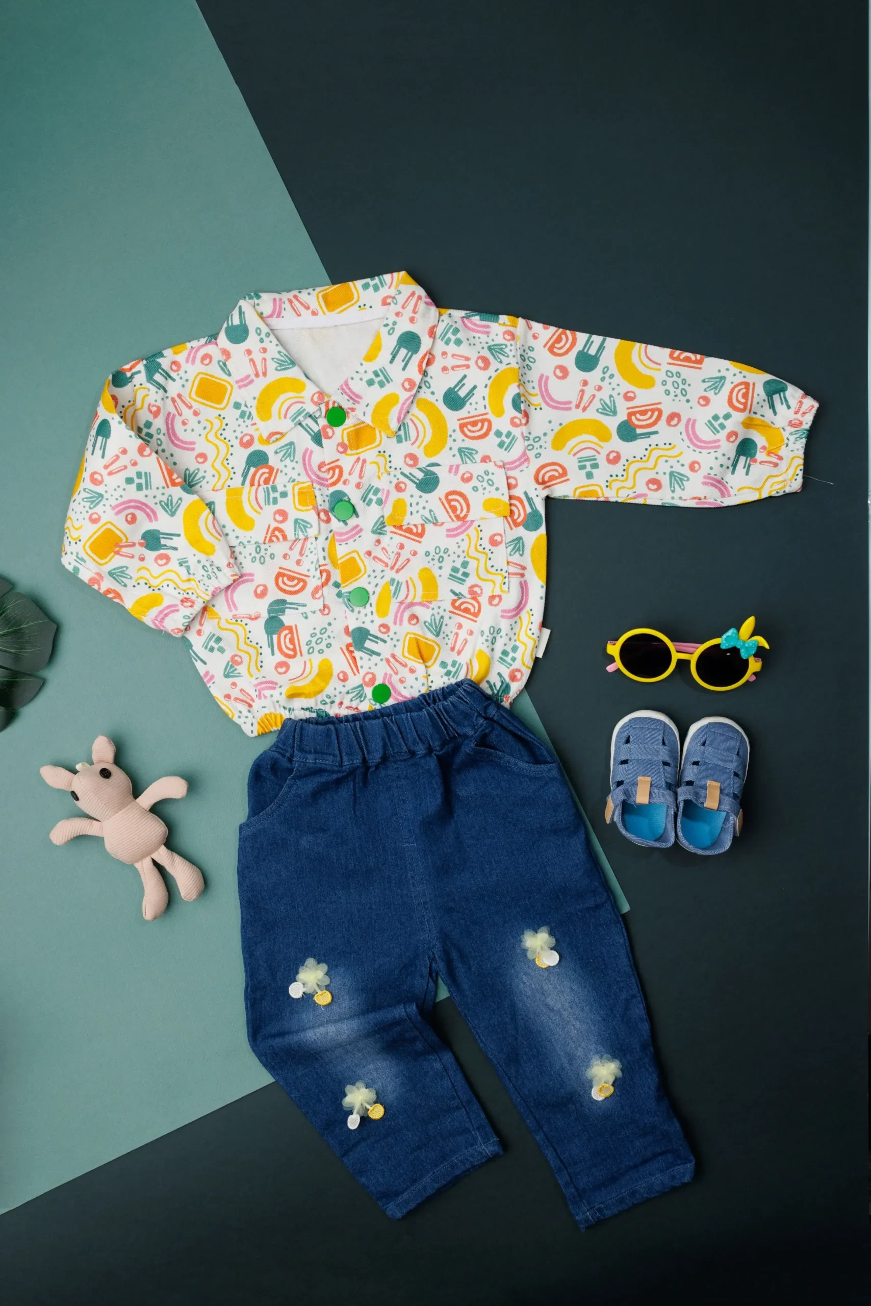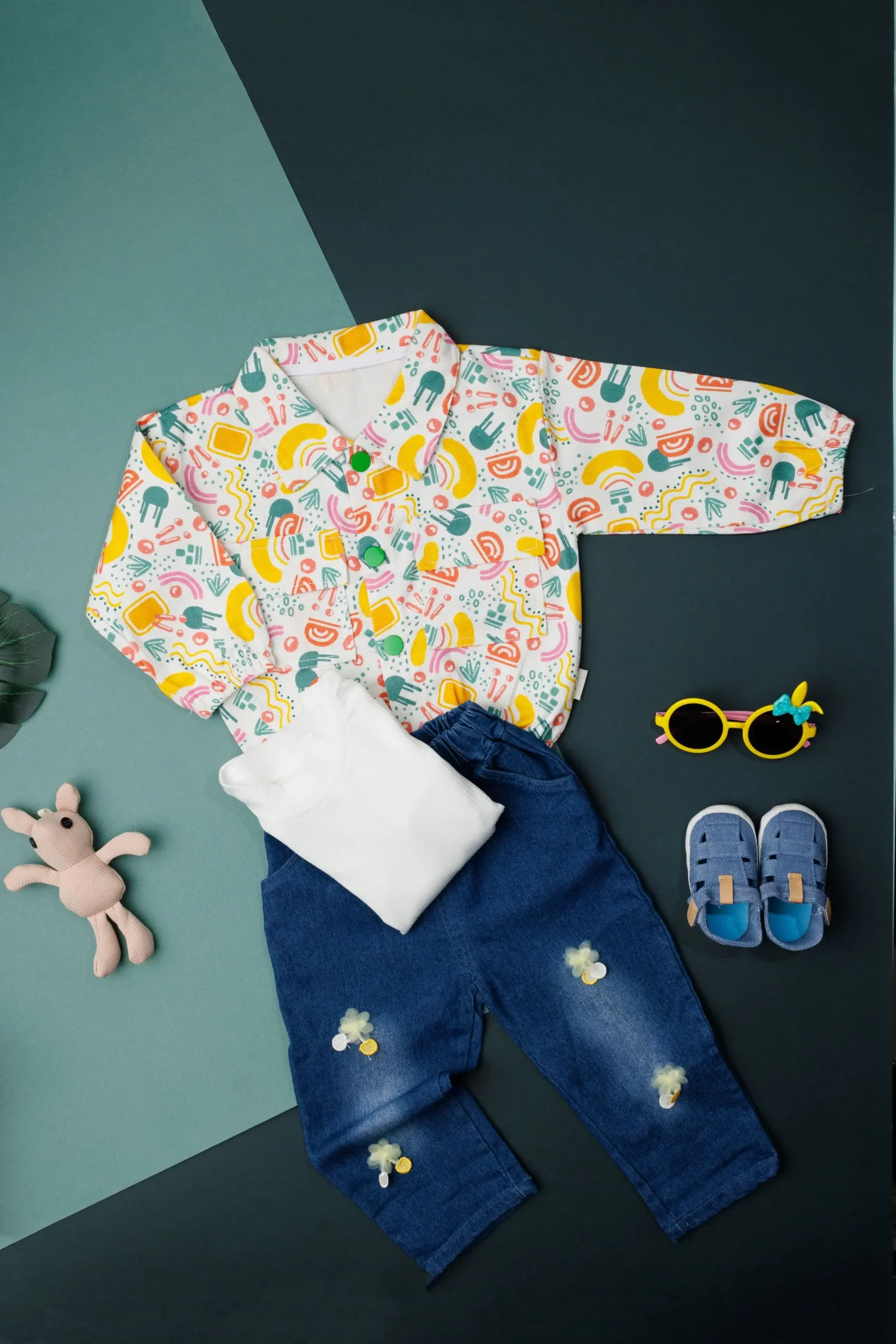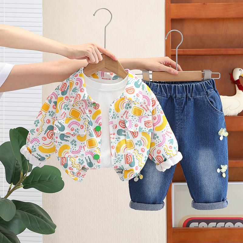 Layered to perfection, this 3-pcs set features a striped T-shirt, a classic shirt, and denim pants, A smart and Stylish combination for a polished yet stylish look.
