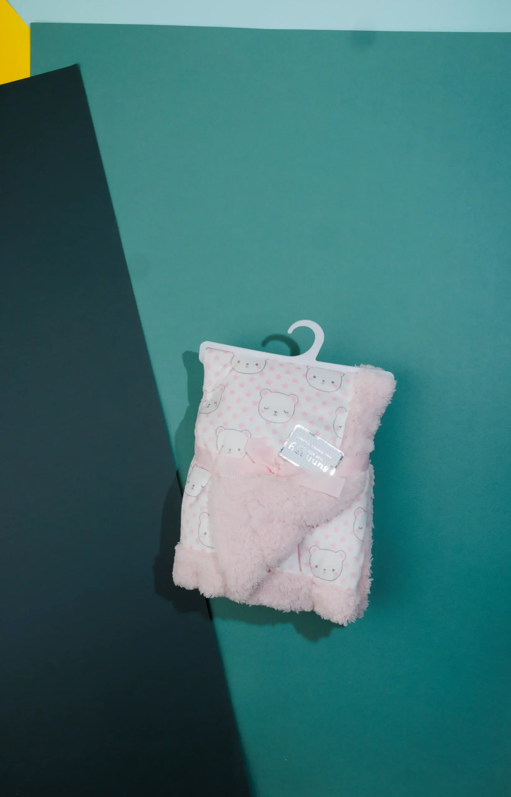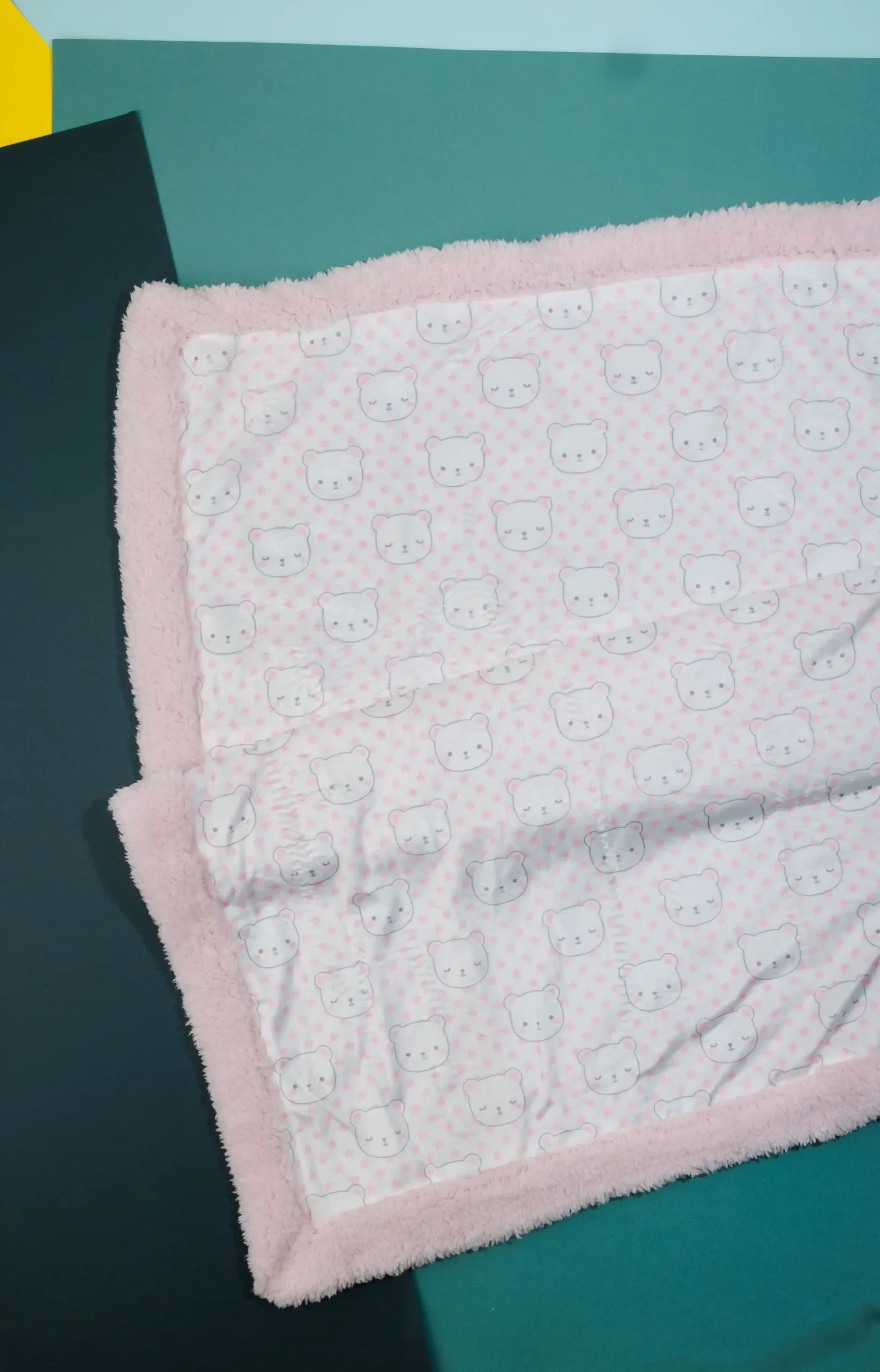 - The blanket is light pink and white with a pattern of small bears and dots.