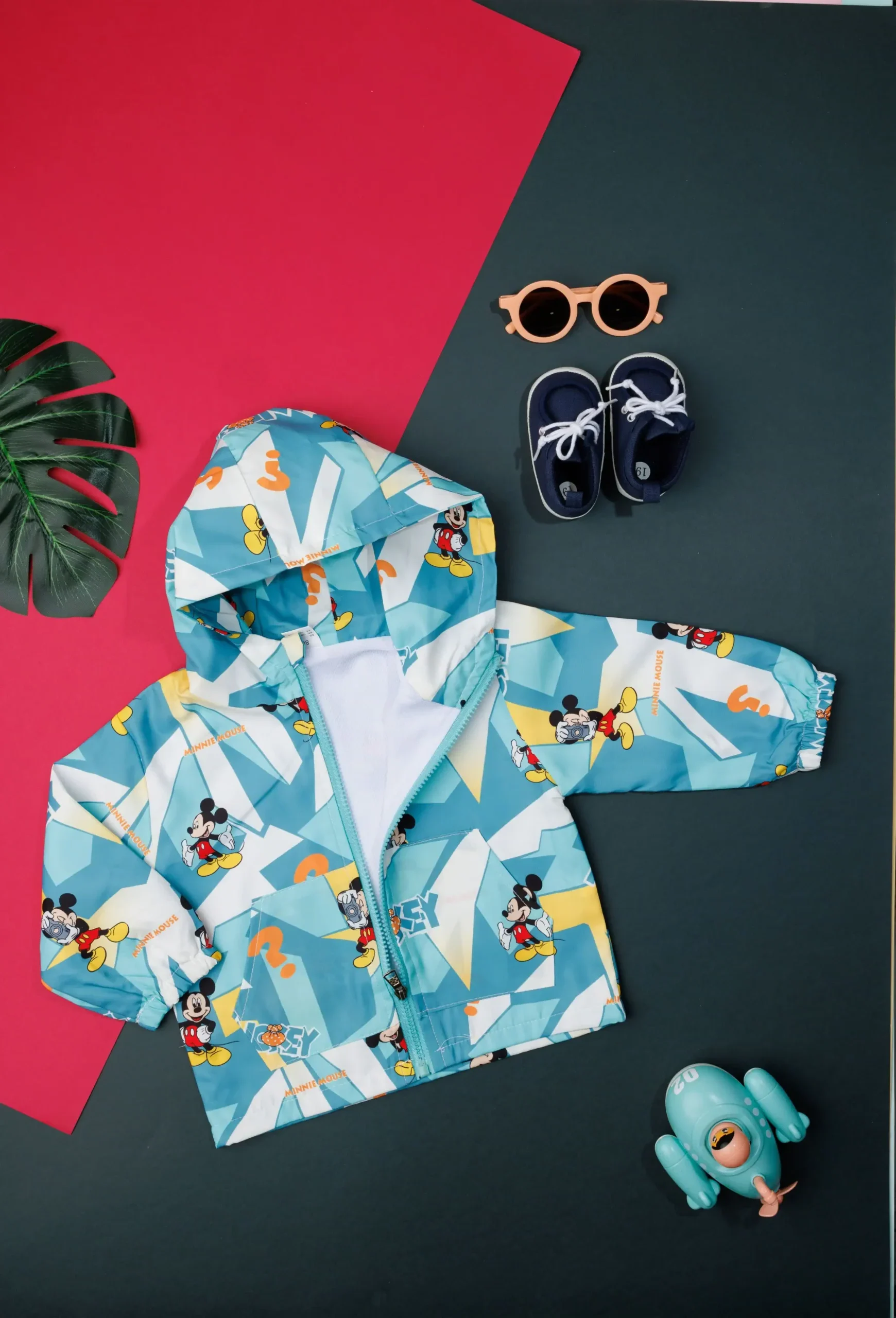 - Sky blue jacket with a Micky mouse pattern