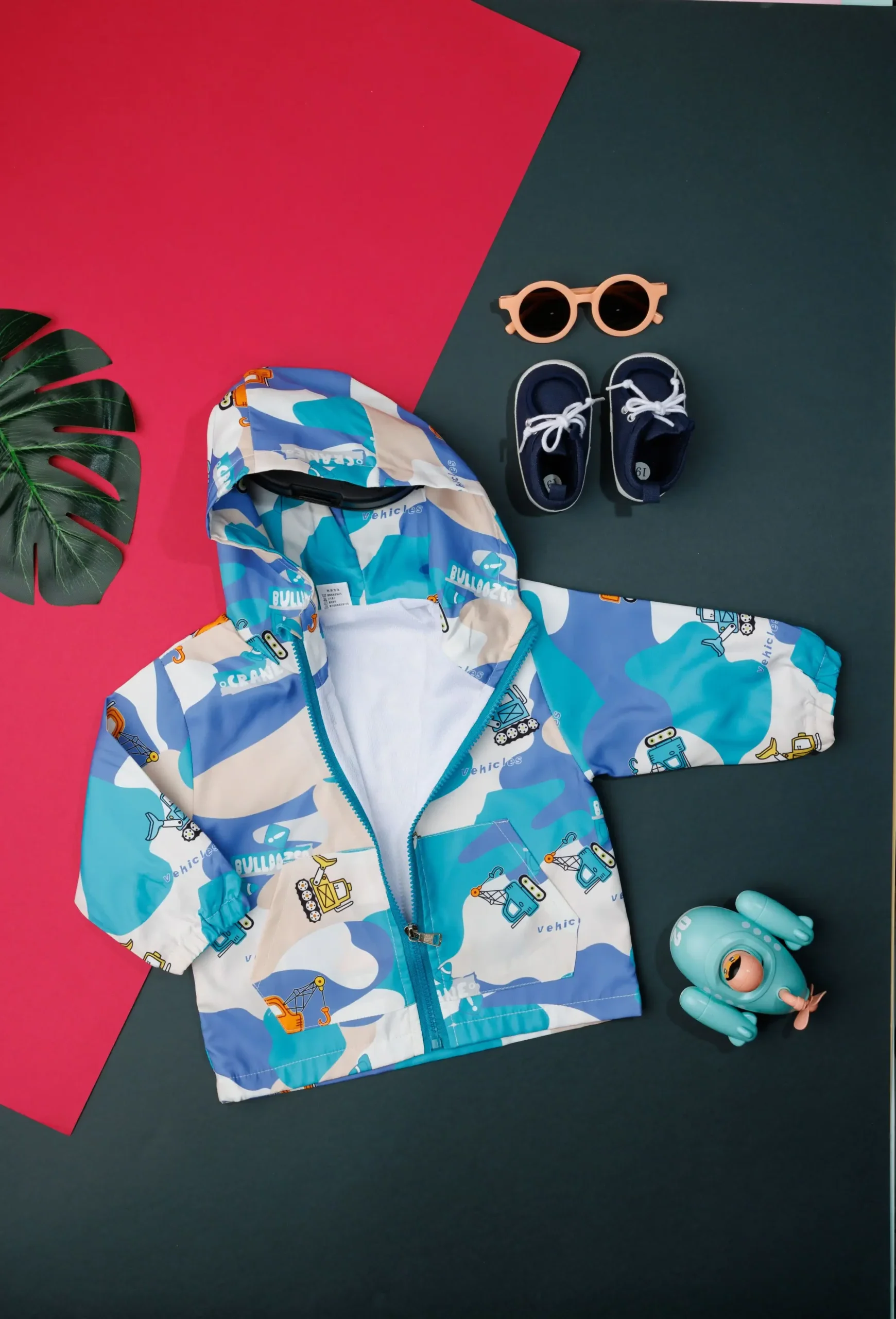 - Sky blue jacket with vehicle pattern