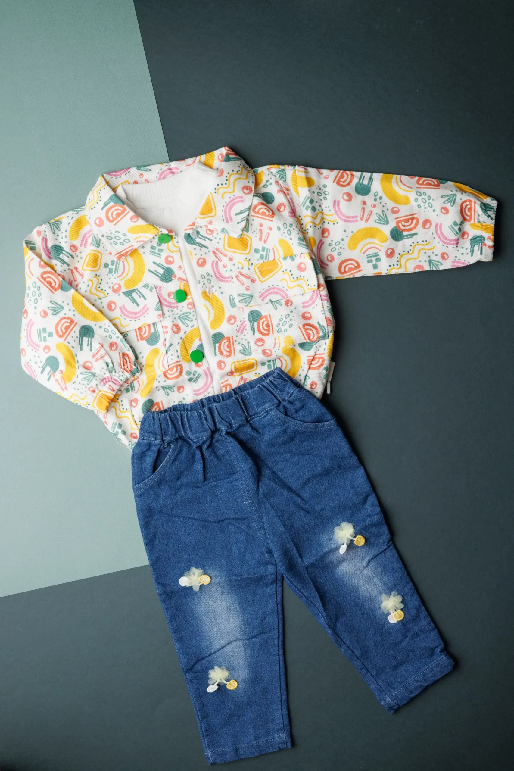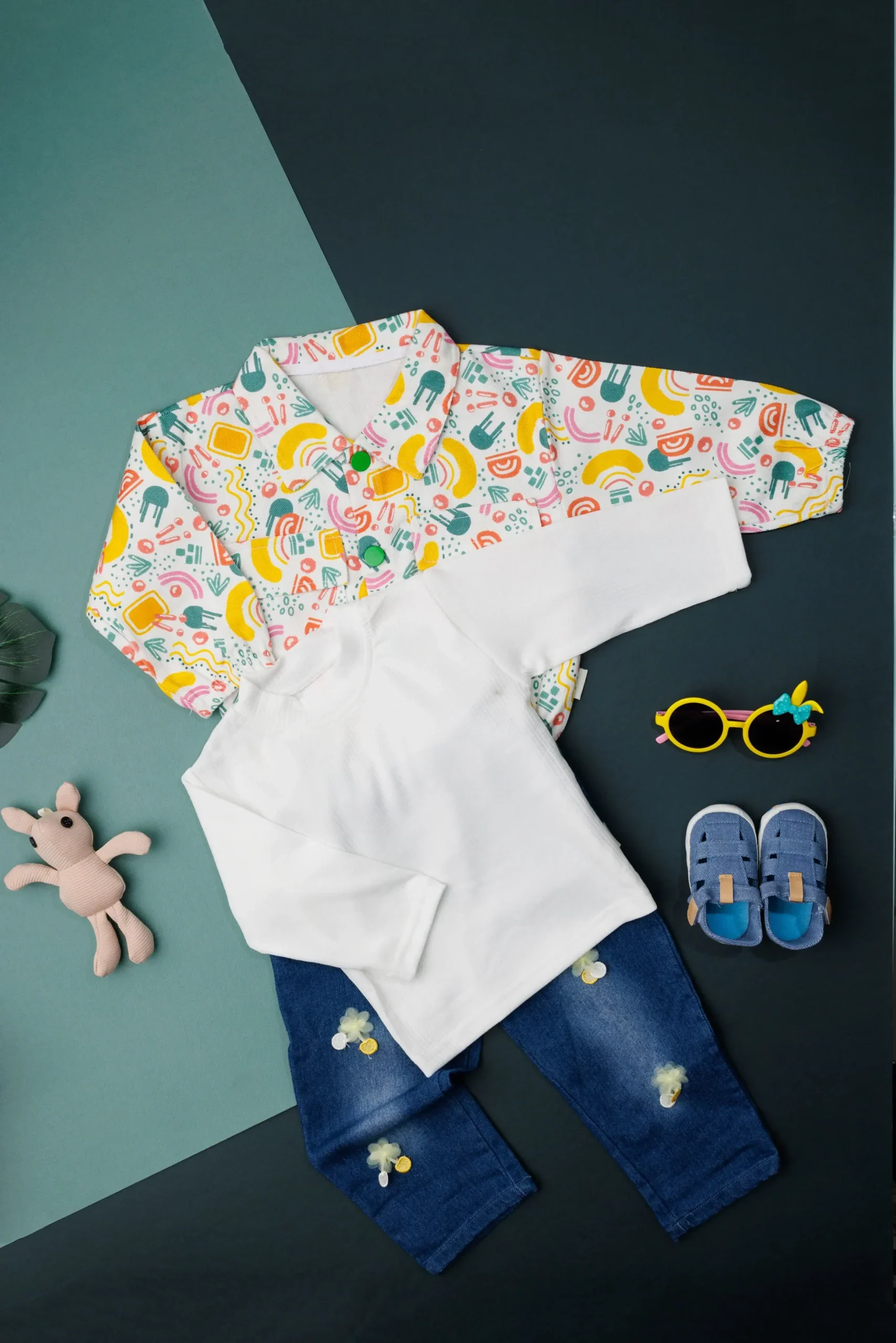 Layered to perfection, this 3-pcs set features a striped T-shirt, a classic shirt, and denim pants, A smart and Stylish combination for a polished yet stylish look.