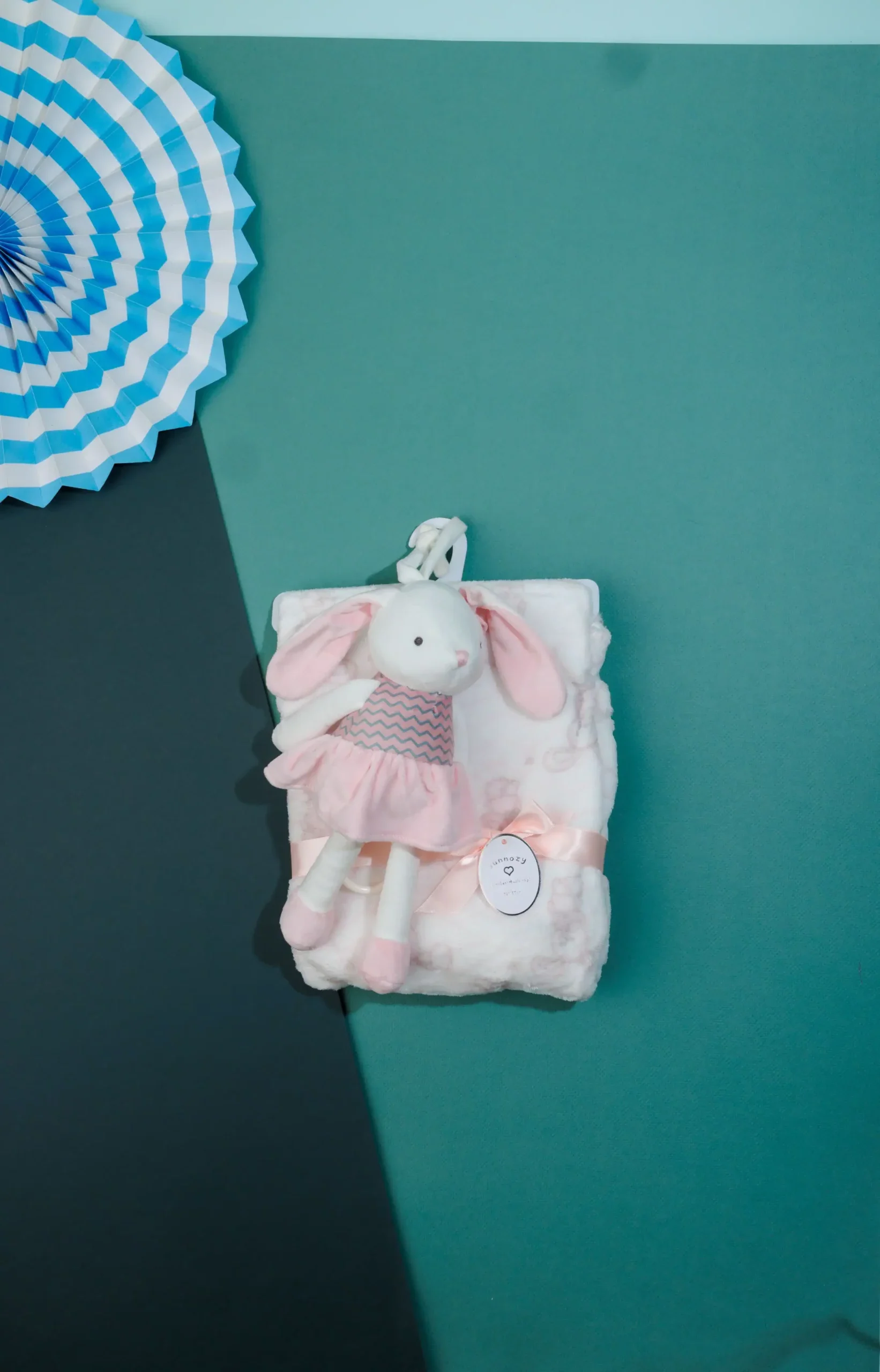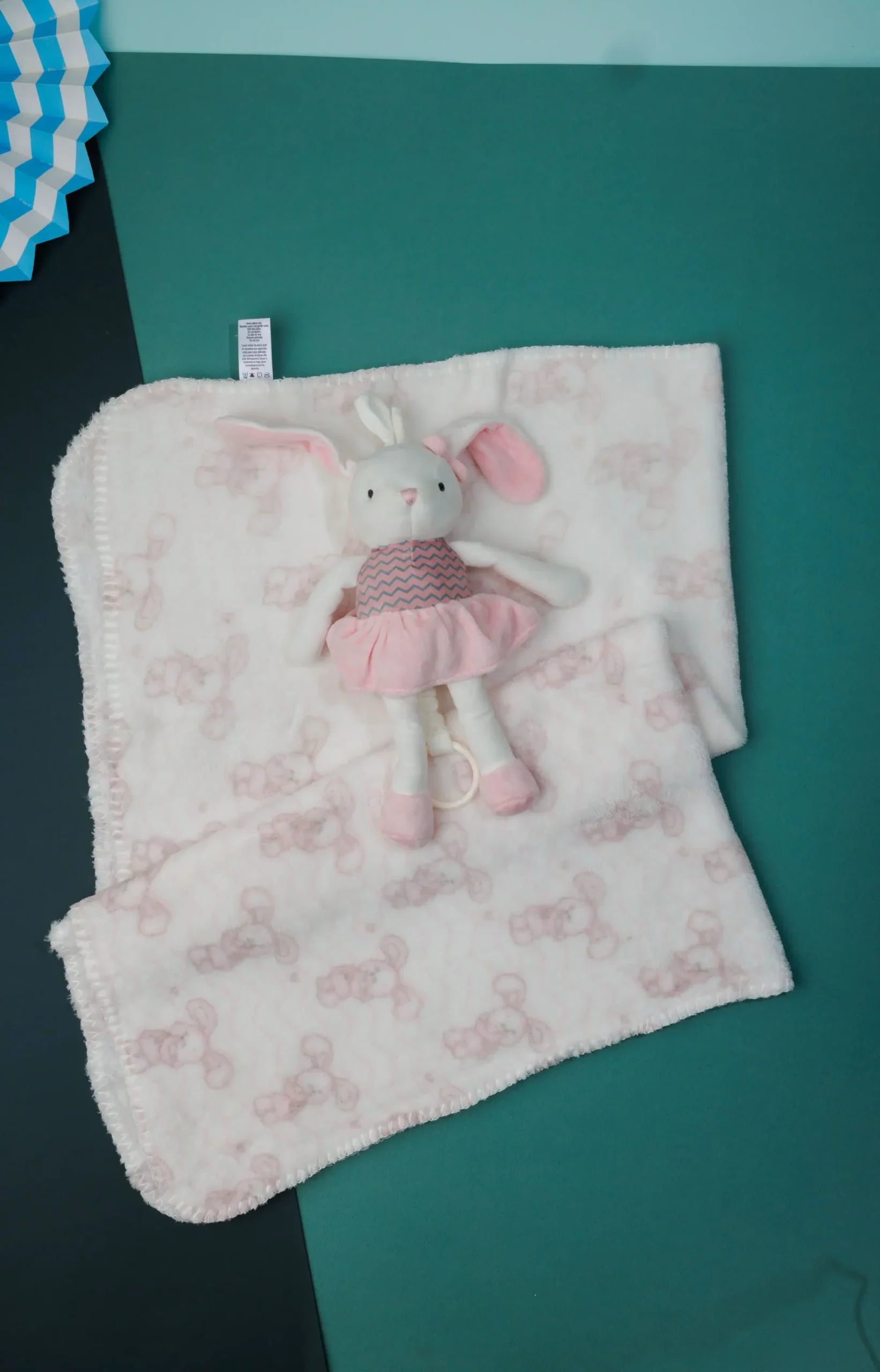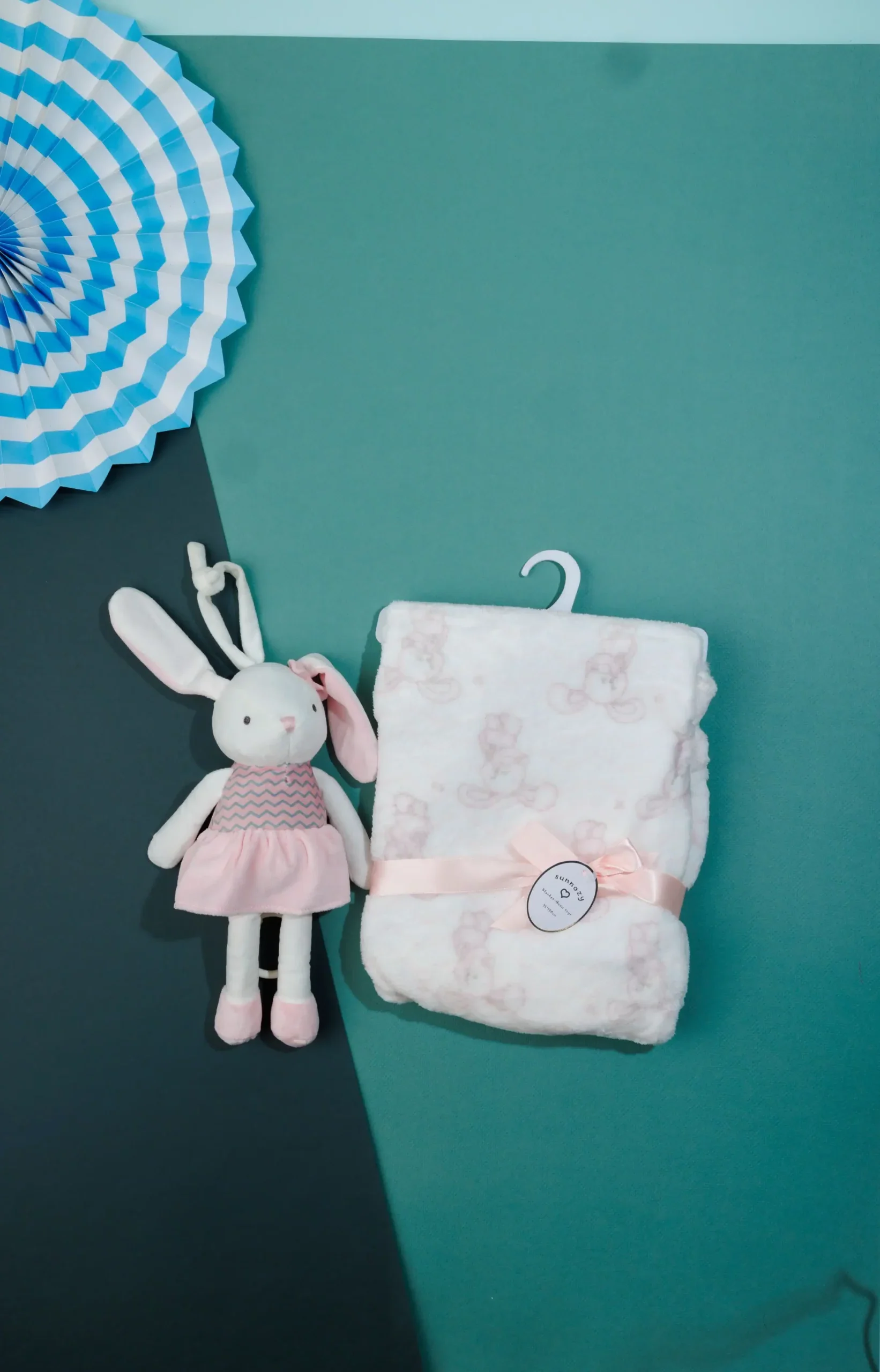 - baby gift set that includes a plush rabbit and a soft blanket.