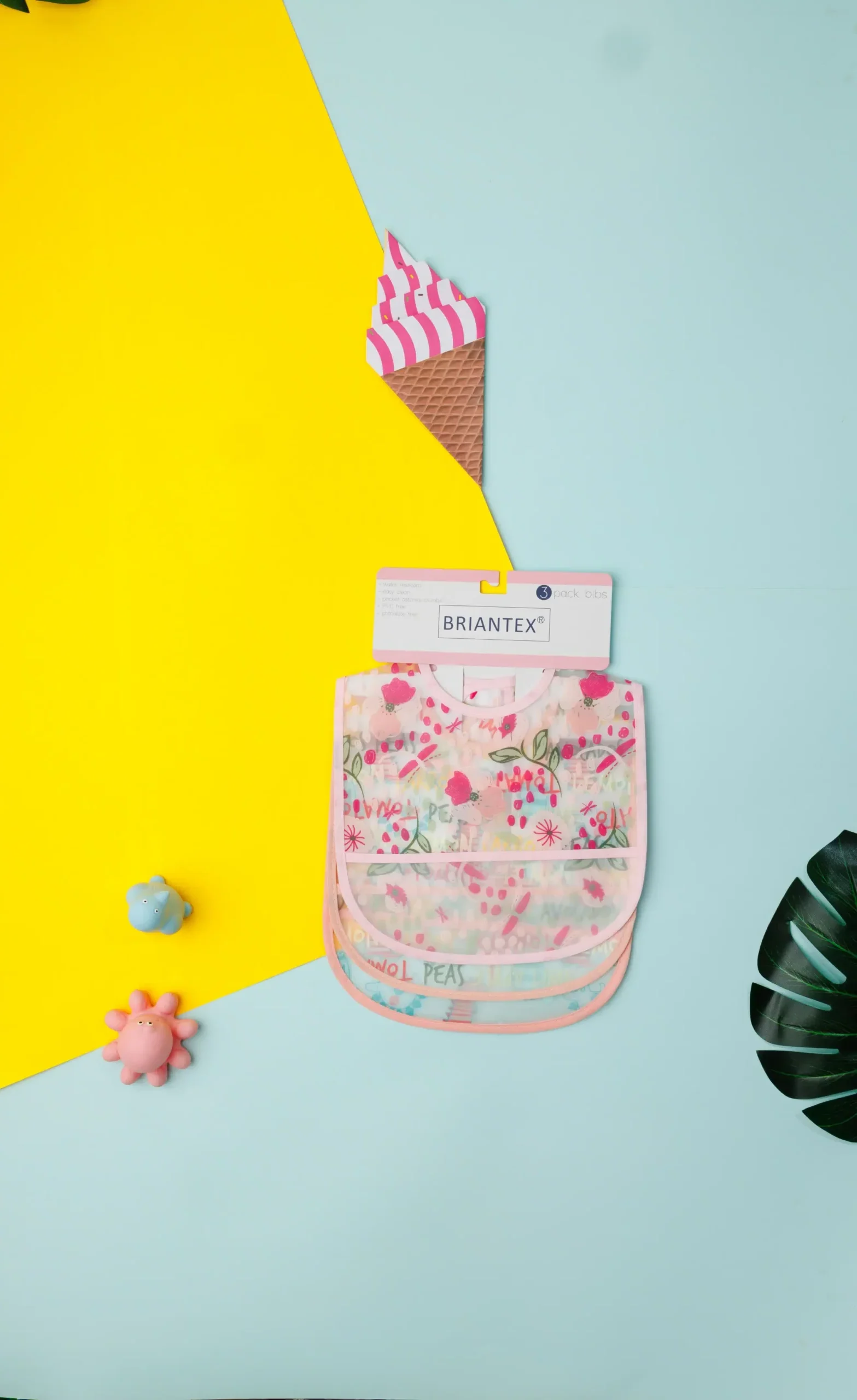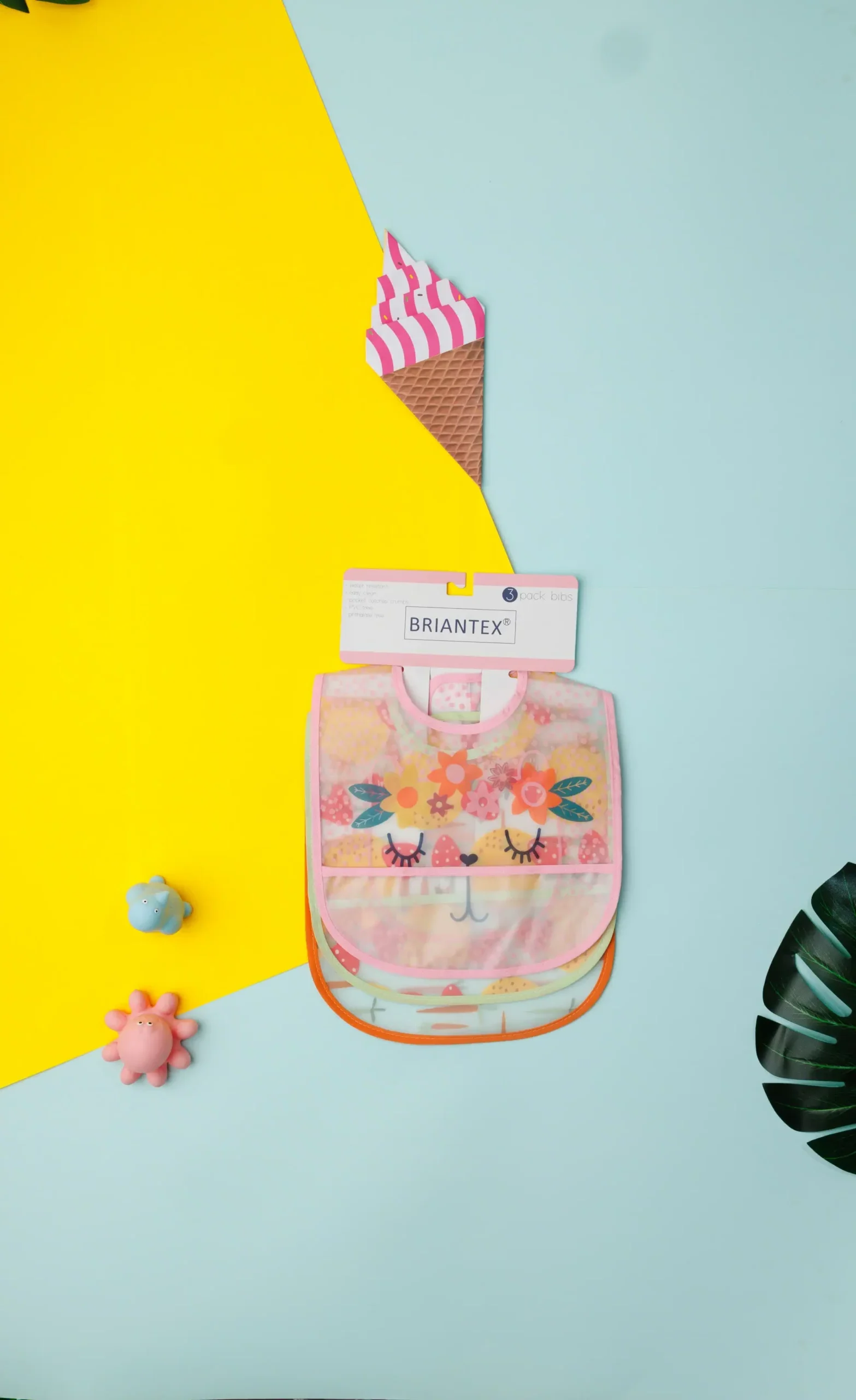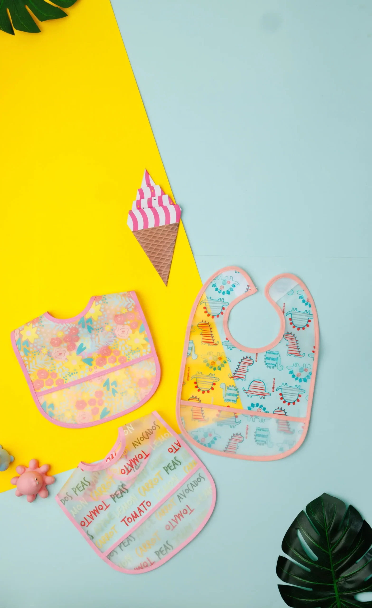 The bibs are designed with different patterns and colors. They are edged with trim and appear to be made of soft fabric. These items are likely intended for use during feeding or to protect a baby’s clothing.