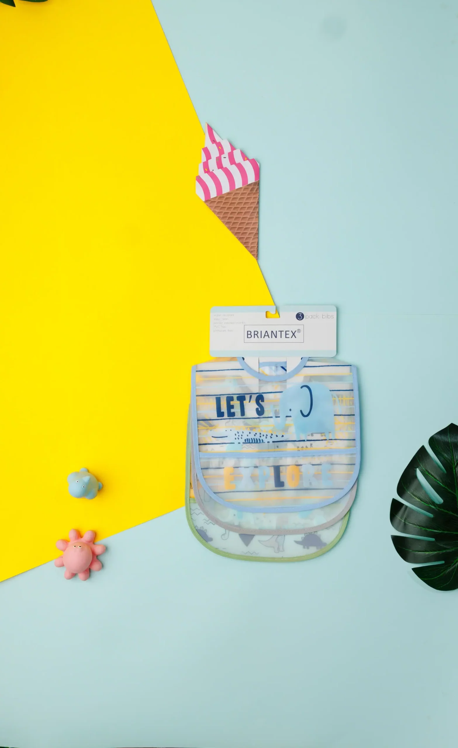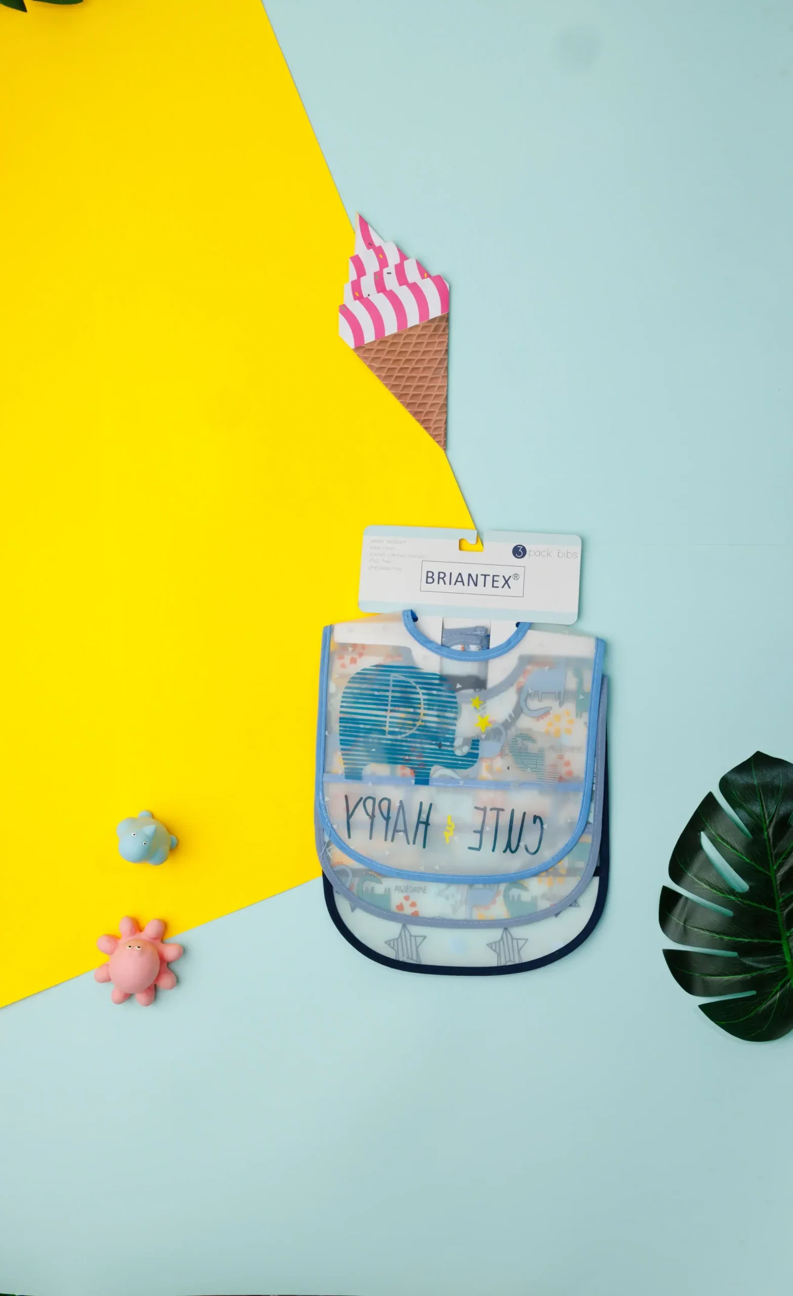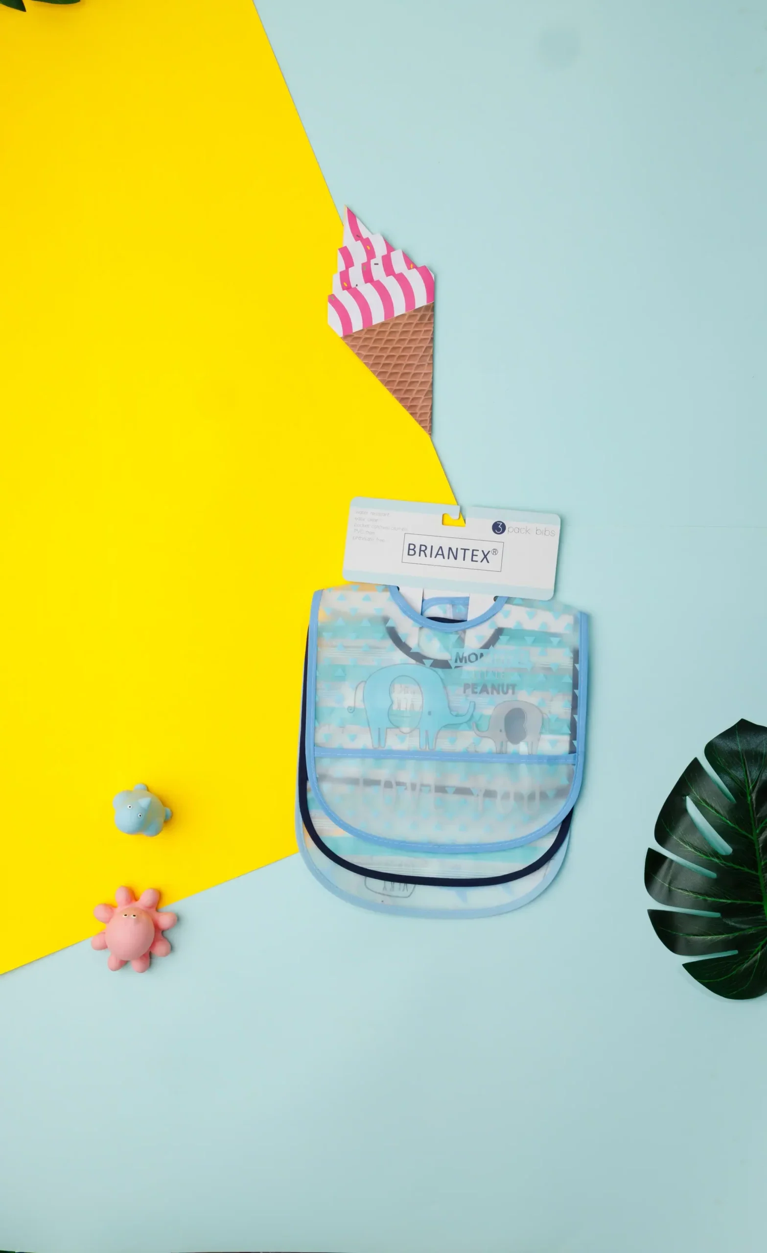 The bibs are designed with different patterns and colors. They are edged with trim and appear to be made of soft fabric. These items are likely intended for use during feeding or to protect a baby’s clothing.